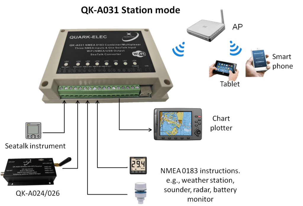 The multiplexer is of quality and its price is incomparable! Commissioning is easy without having to load the interface for PC or Mac operation. The wifi works very well and especially, it allows several addresses at the same time on all platforms, PC, Mac, IIOS, Andro, Linux …. The must is the possibility to adjust the flow rate on all Inputs and outputs so as to be in phase with the AIS at 38500 Baud and the NMEA at 4800 Baud for seaTalk for example. Ultimately, the most would be to have NMEA 2000 … but to date the QK-A031 is of the best in NMEA183!