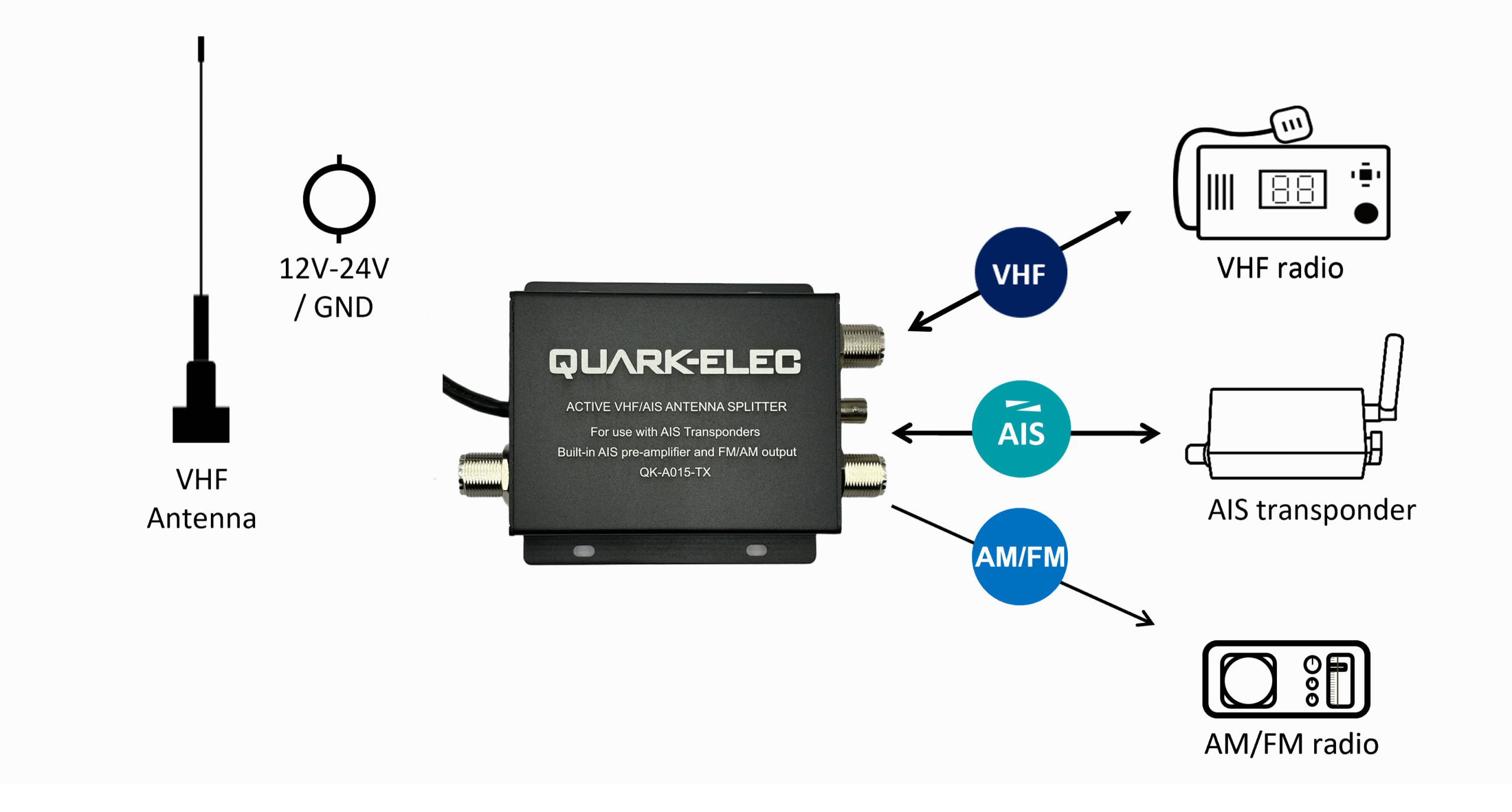 • The QK-A015-TX Active AIS-VHF Antenna Splitter allows one VHF antenna to be shared between VHF and AIS devices:
